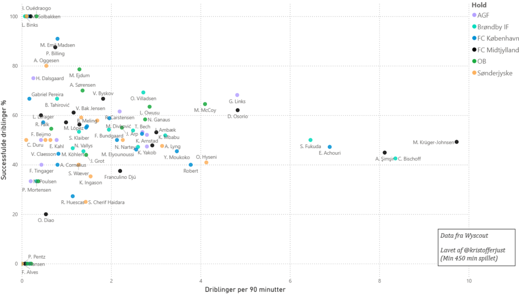 Her til sidst, zoomer vi ind på ligaens ubestridte driblekonger. FC Midtjyllands M. Krüger-Johnsen og Brøndbys C. Bischoff har været i en liga for sig selv, når det gælder modet til at udfordre deres direkte modstander. Krüger-Johnsen topper volumen-listen med næsten 10 driblinger per kamp, hvilket vidner om en ekstremt offensiv og udfordrende spillestil, selvom succesraten lander på omkring de 50%.
