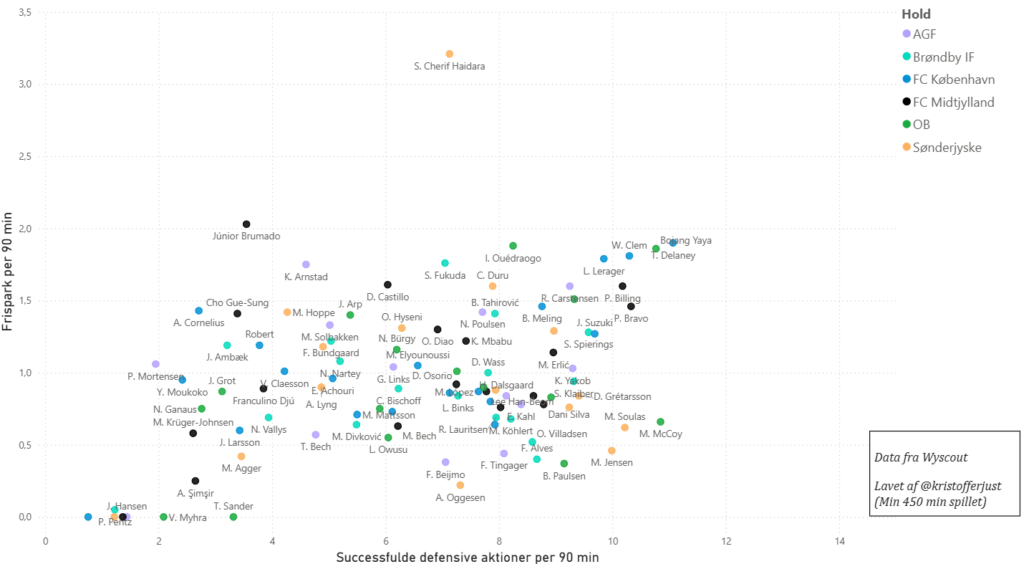 Vi er godt i gang med sæsonen 25/26. Som en lille: “nu starter suppen op igen”, har jeg kigget på lidt Wyscout data. Her kigger vi på lidt forskelligt, noget af det defensive, offensive, driblinger og mere. Fælles for dem alle er, at jeg holder to metrikker op mod hinanden for spillerne i den nuværende Top 6. Lad os starte med det defensive!