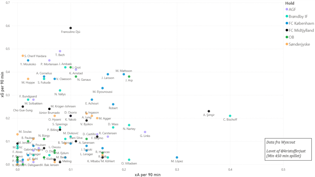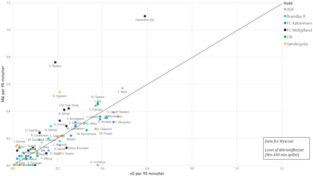 Når vi ser på effektiviteten foran kassen, er der ingen vej udenom Franculino Djú fra FC Midtjylland, som har ejet efteråret med en fuldstændig vanvittig målrate, der sprænger skalaen og ligger langt over hans forventede mål. Profiler som V. Byskov og K. Ingason viser også en imponerende kynisme ved at score markant mere, end chancerne (datamæssigt) egentlig berettiger til.