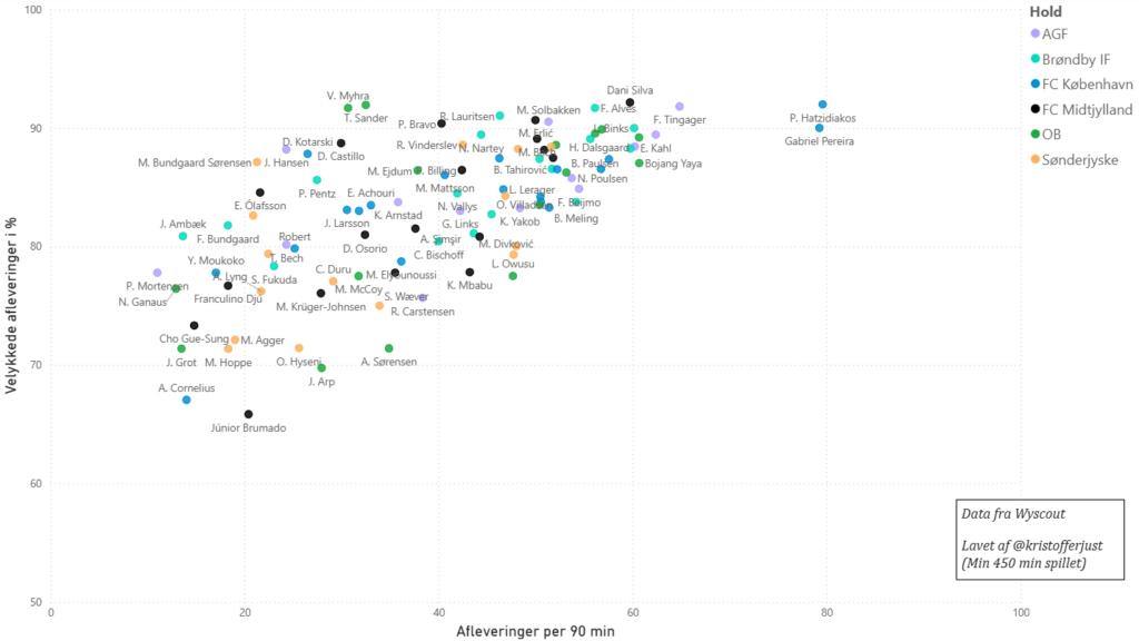 Efteråret har vist, at hvis man vil se bolden blive flyttet med både kynisme og kvantitet, skal man kigge mod Parken, hvor Gabriel Pereira og P. Hatzidiakos fungerer som ligaens ubestridte omdrejningspunkter med omkring 80 afleveringer per kamp og en træfsikkerhed, der runder de 90%. De er i en liga for sig selv, når det kommer til at diktere tempoet, mens spillere som Dani Silva fra FCM og F. Tingager fra AGF står for den kirurgiske præcision med nogle af ligaens højeste succesrater. I den stik modsatte ende af skalaen finder vi de mere risikovillige som Júnior Brumado, A. Cornelius, J. Arp hvis tal afspejler en risikovillig stil med både lav volumen og en succesrate på kun omkring 66%.