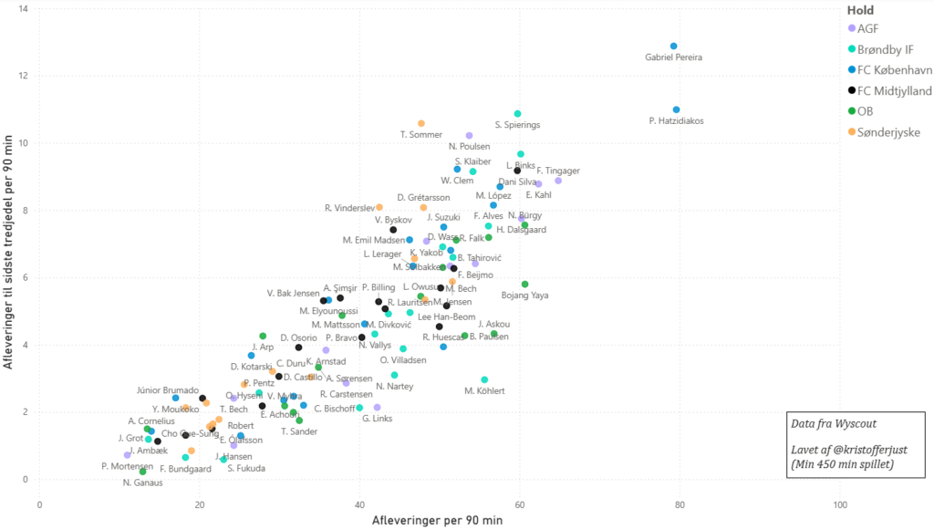 Når vi kigger på evnen til at drive bolden fremad i banen, cementerer FCK-duoen Gabriel Pereira og P. Hatzidiakos deres status som ligaens mest dominante spilfordelere. De leverer ikke blot flest afleveringer generelt, som tidligere analyseret, men de er også i en absolut særklasse, når det kommer til at finde medspillere på banens sidste tredjedel med henholdsvis ca. 11 og 13 fremadrettede afleveringer per kamp.